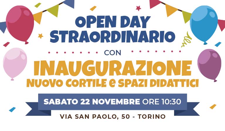Per condividere con voi questa importante tappa, vi invitiamo al nostro Open Day straordinario con inaugurazione del nuovo cortile e degli spazi didattici.